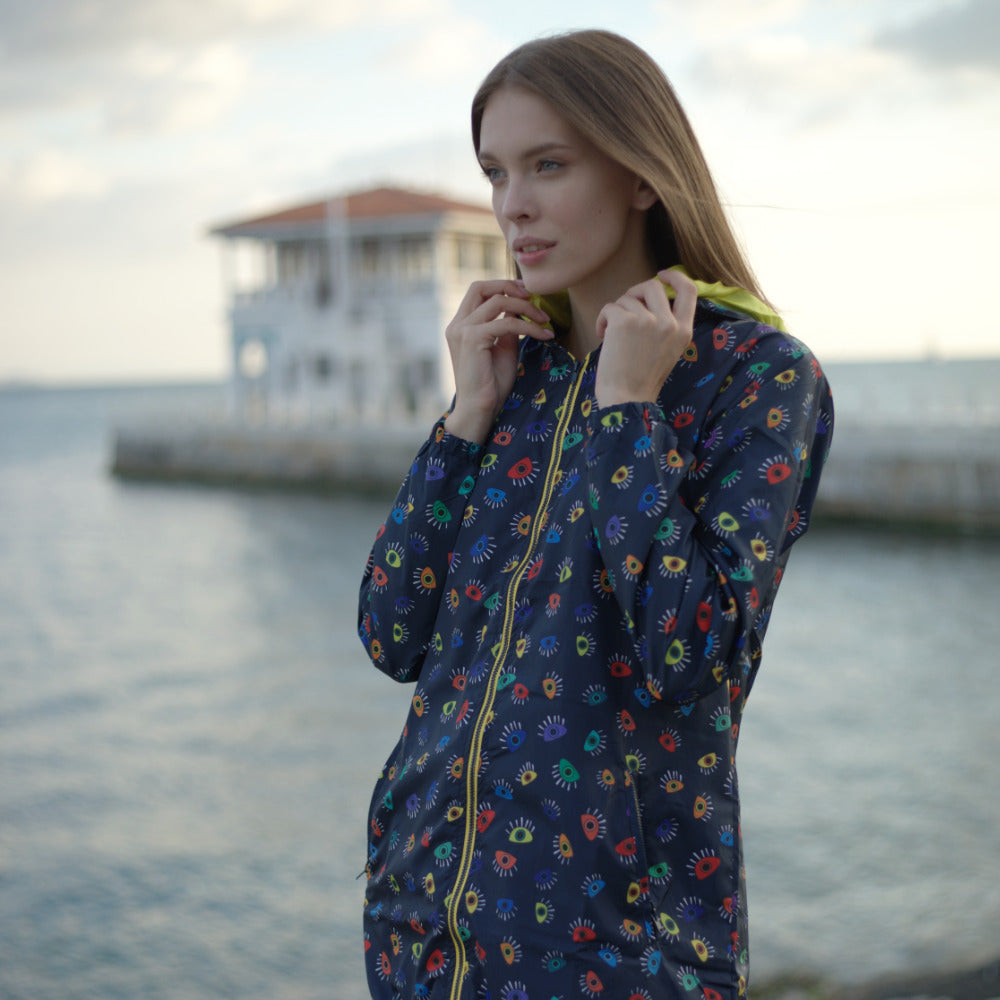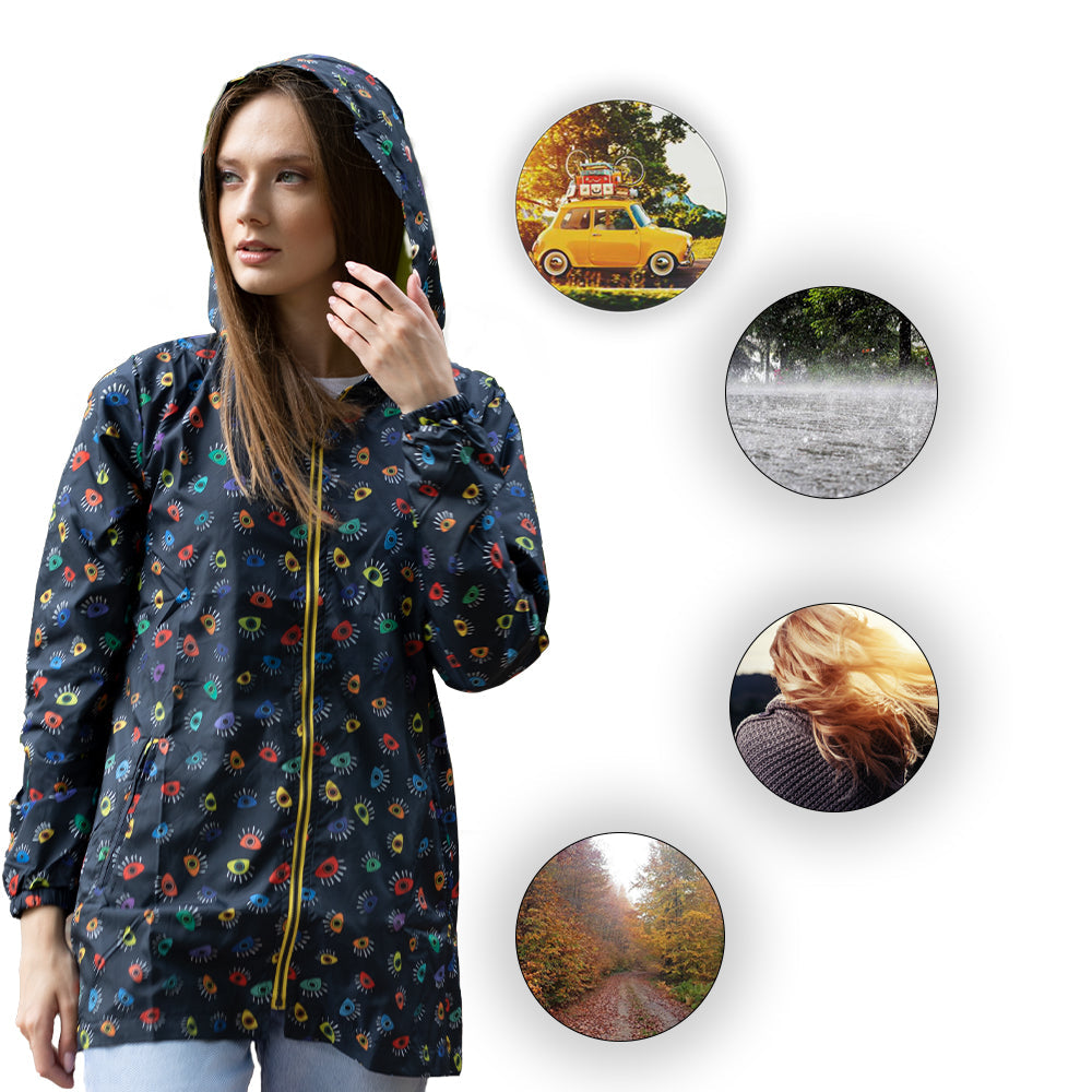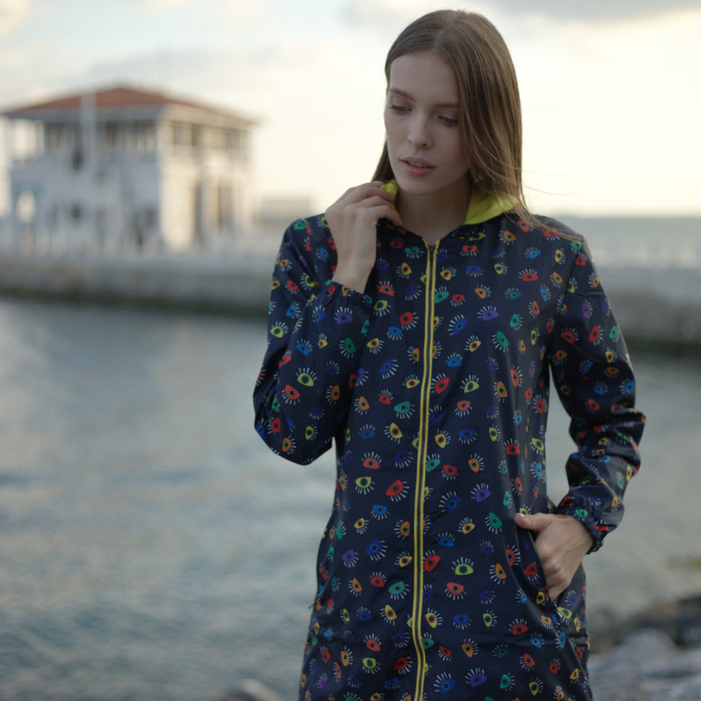 Elevate your rainy day fashion with the Biggdesign My Eyes On You Long Waterproof Hooded Raincoat. With its high-quality zippers and water-resistant fabric, it's designed for practicality and style. Don't let the weather dampen your fashion sense—grab this raincoat and step out in confidence.