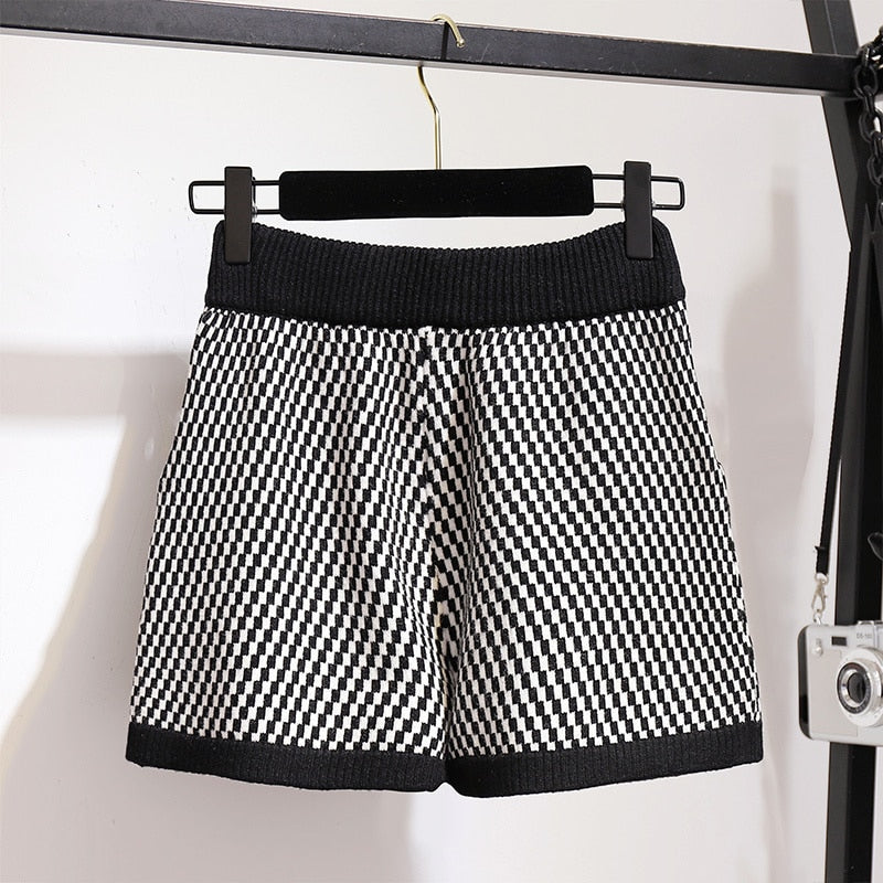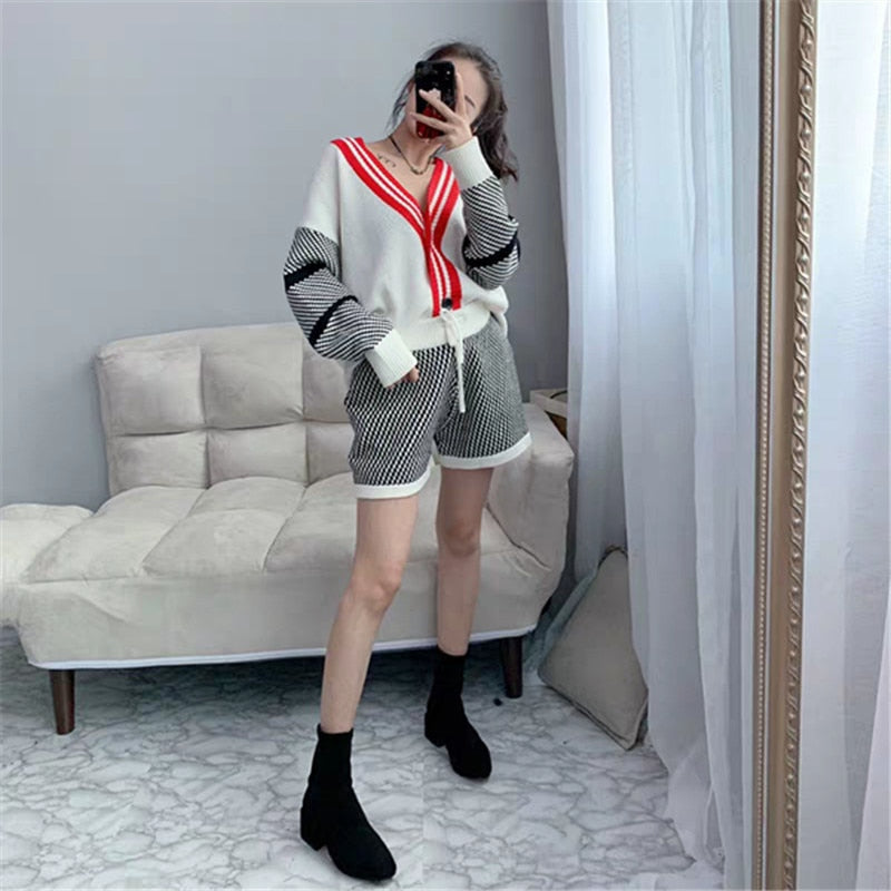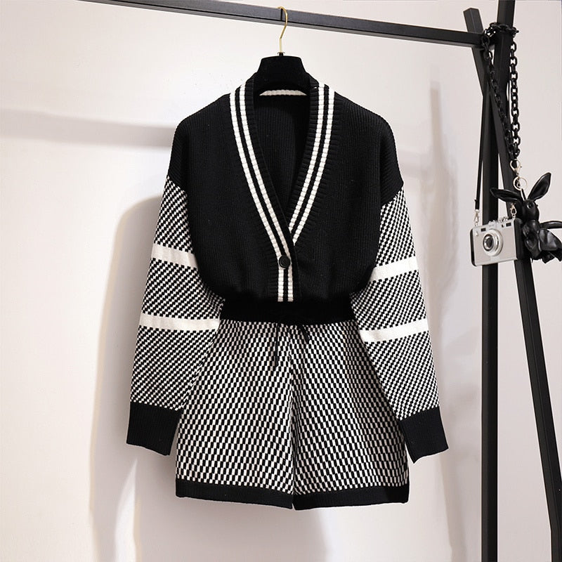 Korean Style V-collar Long-sleeved Knitted Cardigan and Shorts | Two Piece Set for Women | Fashion Knitting Patchwork 2Pcs Outfits