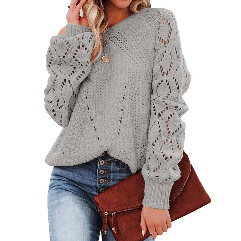 Lantern Sleeve Knitted Sweater Woman Autumn Winter Hollow Out Sweater