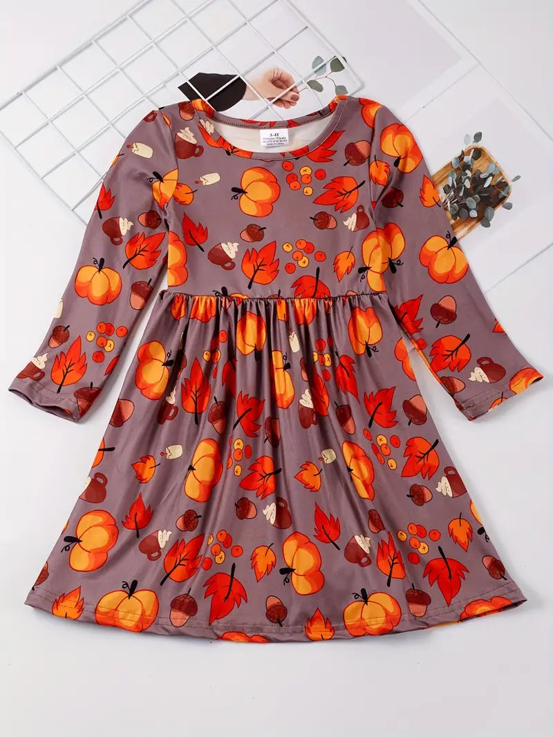 Kids Dress | Kids Autumn Dress | Harvest Long Sleeve Twirly Dress (Thanksgiving)