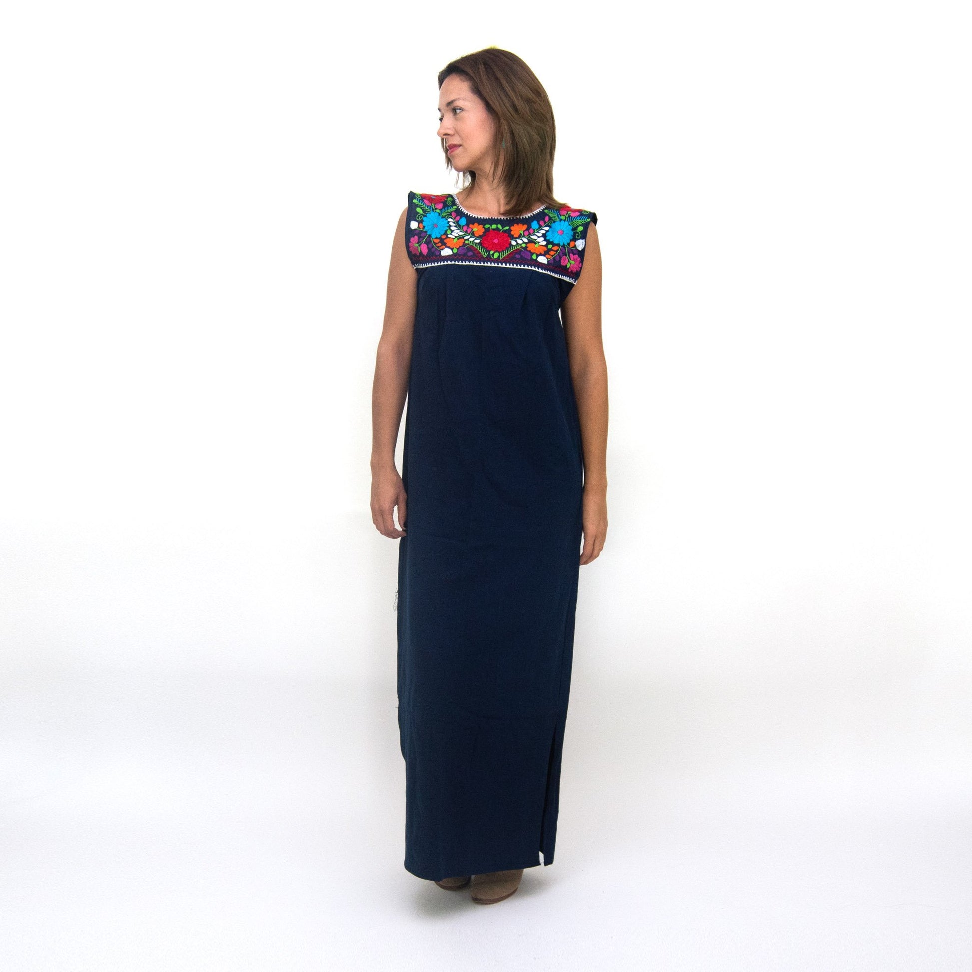 - Timeless Versatility: This Maxi Isidra dress is a celebration of Mexican fashion, hand-embroidered with multicolored flowers on rich navy blue cotton fabric. It's a testament to timeless elegance and versatility.